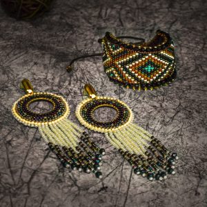 Este producto es elaborado por un grupo de mujeres. Sus materiales son mostacilla y apliques con baños de oro.